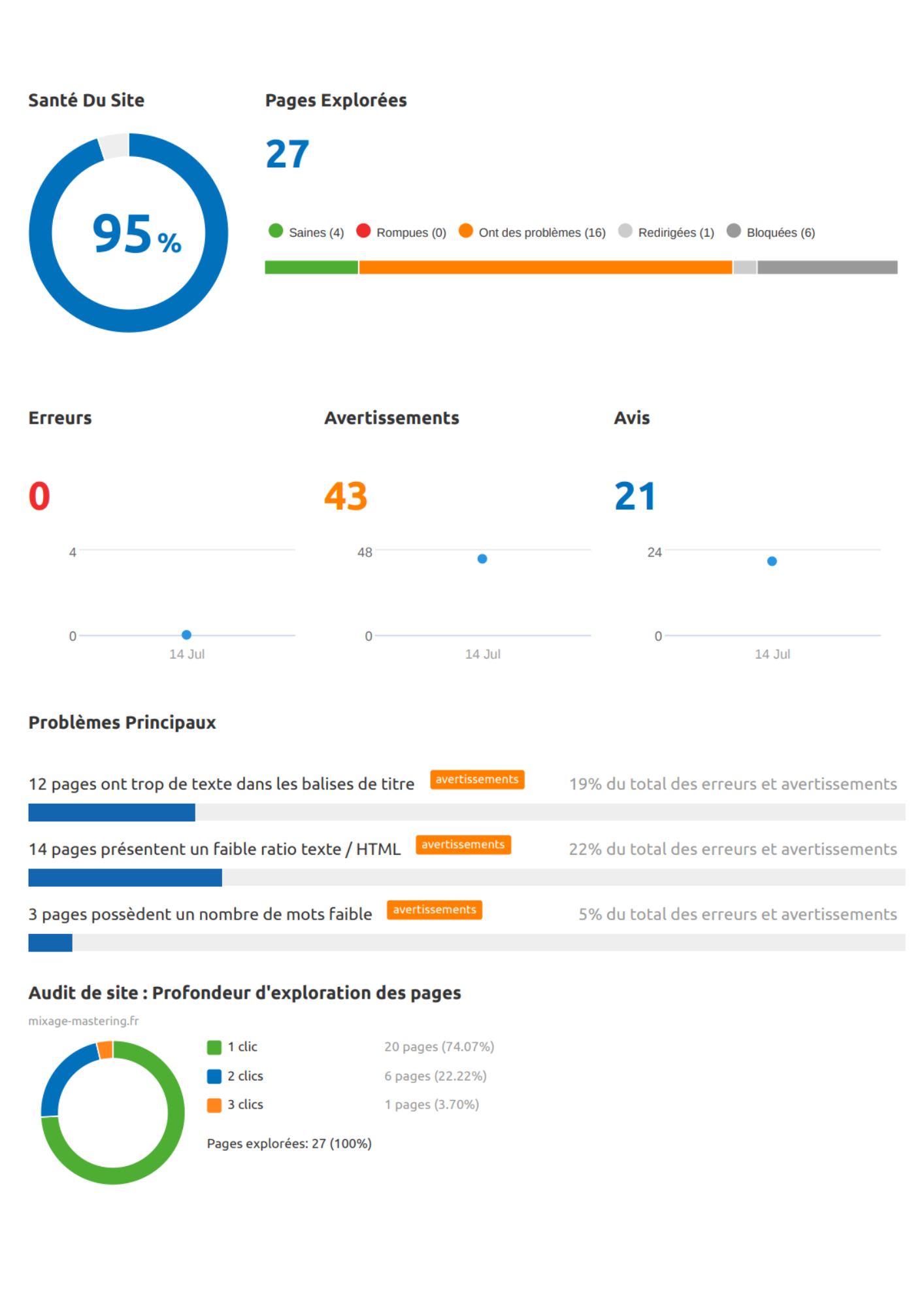 Cette partie sert principalement à vérifier que toute la technique de votre site est bien faite d’un point de vue SEO. On regarde la performance (vitesse), les Hn, les meta textes, l’indexation des pages, l’architecture, le maillage interne, le poids des images, la profondeur du site web etc. On relève ensuite les erreurs et les point à corriger et à améliorer. Certains points peuvent paraître être des détails, mais d’autres impactent grandement vos positions sur les moteurs de recherche.Â